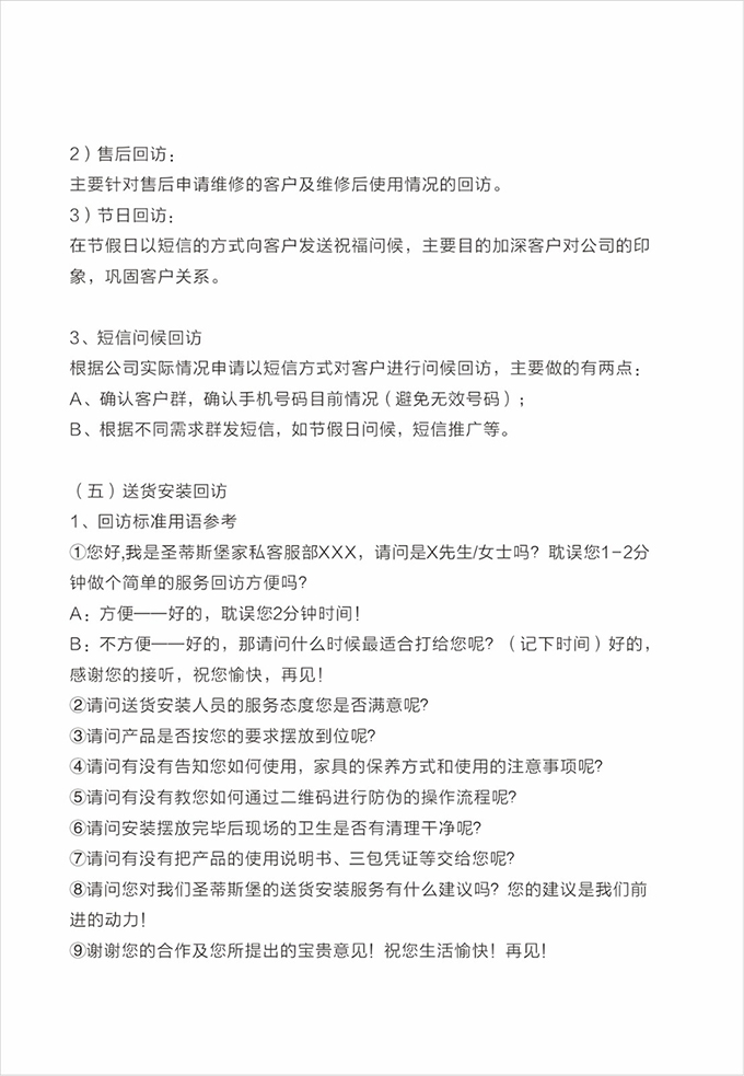 话术参考:“**先生/女士您好,我是圣蒂斯堡的售后服务人员**,您购买的圣蒂斯堡家具已经全部到货了,送货安装大约需要**时间,请问您这边什么时候方便我们上门送货安装呢?”同时要了解送货小区的电梯、楼道、入户门的尺寸等,提前做好准备,避免意外情况。最后确定送货时间(安装所需要时长),并告知客户安装人员的相关信息,可加微信发送,并发送配送安装流程说明。