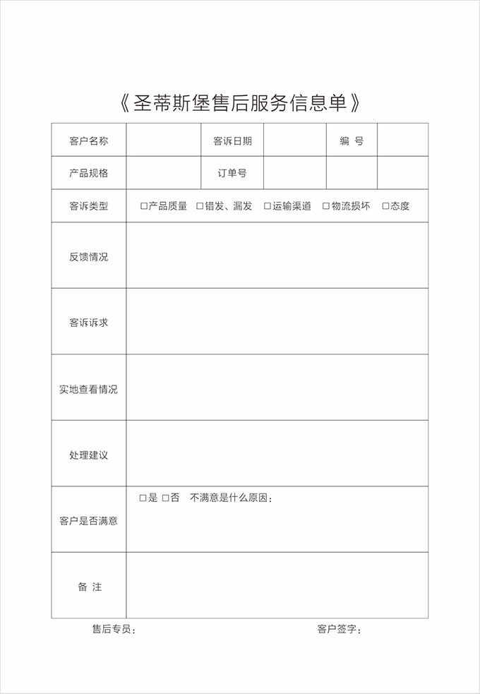 1、导购、店面、售后人员接到维修等售后问题来电时,第一时间先安抚好客户情绪,认真倾听客户的问题描述,并尽量问清存在的问题和故障现象,应详细记录顾客名字、联系电话、地址、商品型号、问题等信息,将这些信息登记于《售后服务跟踪单》上后,再次确认客户问题及诉求,看是否有遗漏,确认无误后回复客户多长时间给他答复;